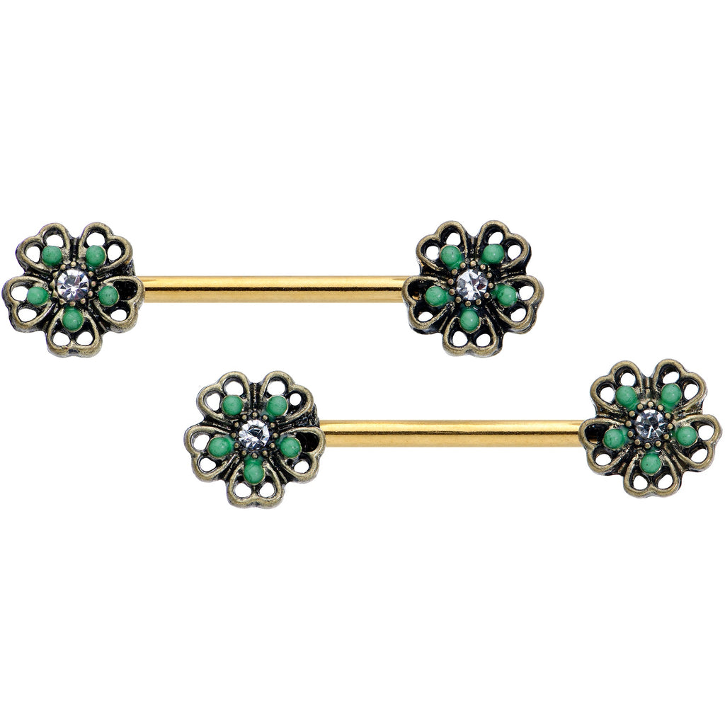 14 Gauge 9/16 Gold Tone Green Flower St Patricks Day Nipple Ring Set
