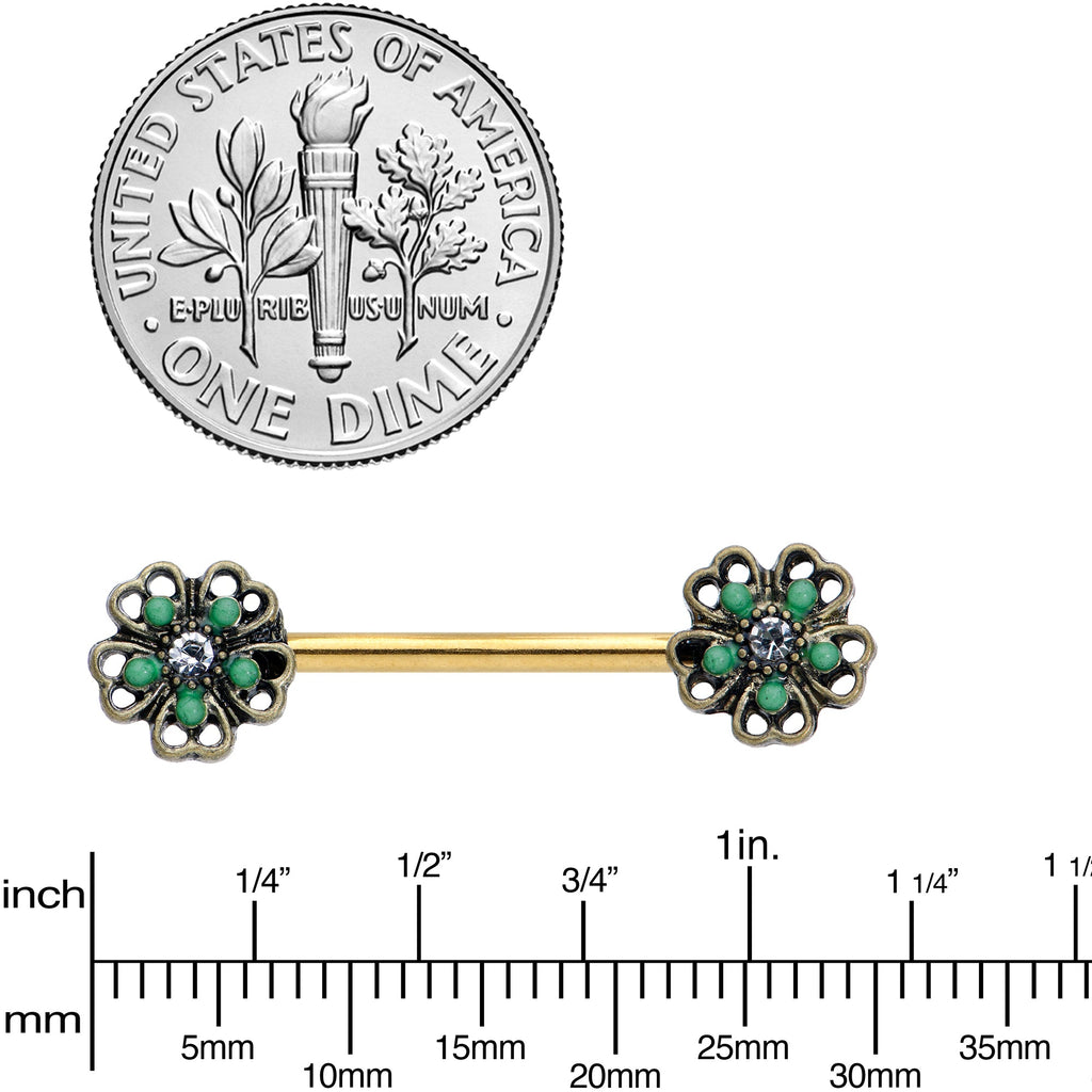 Let your look bloom in its own unique way with this 14 gauge nipple jewelry! It's made with 14mm gold tone PVD over 316L surgical grade stainless steel straight barbells. Each of the ends features a flower charm with openwork petals. The petals are embellished with green orbs and they have a clear gem at the center. Rock some nipple rings that are as lovely and unique as you are with these fantastic flower nipple piercing rings! Sold as a set of two.Specifications