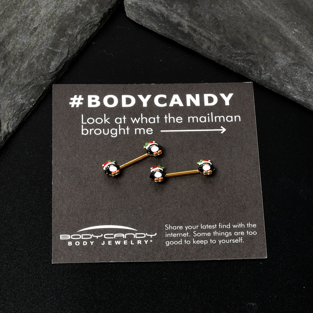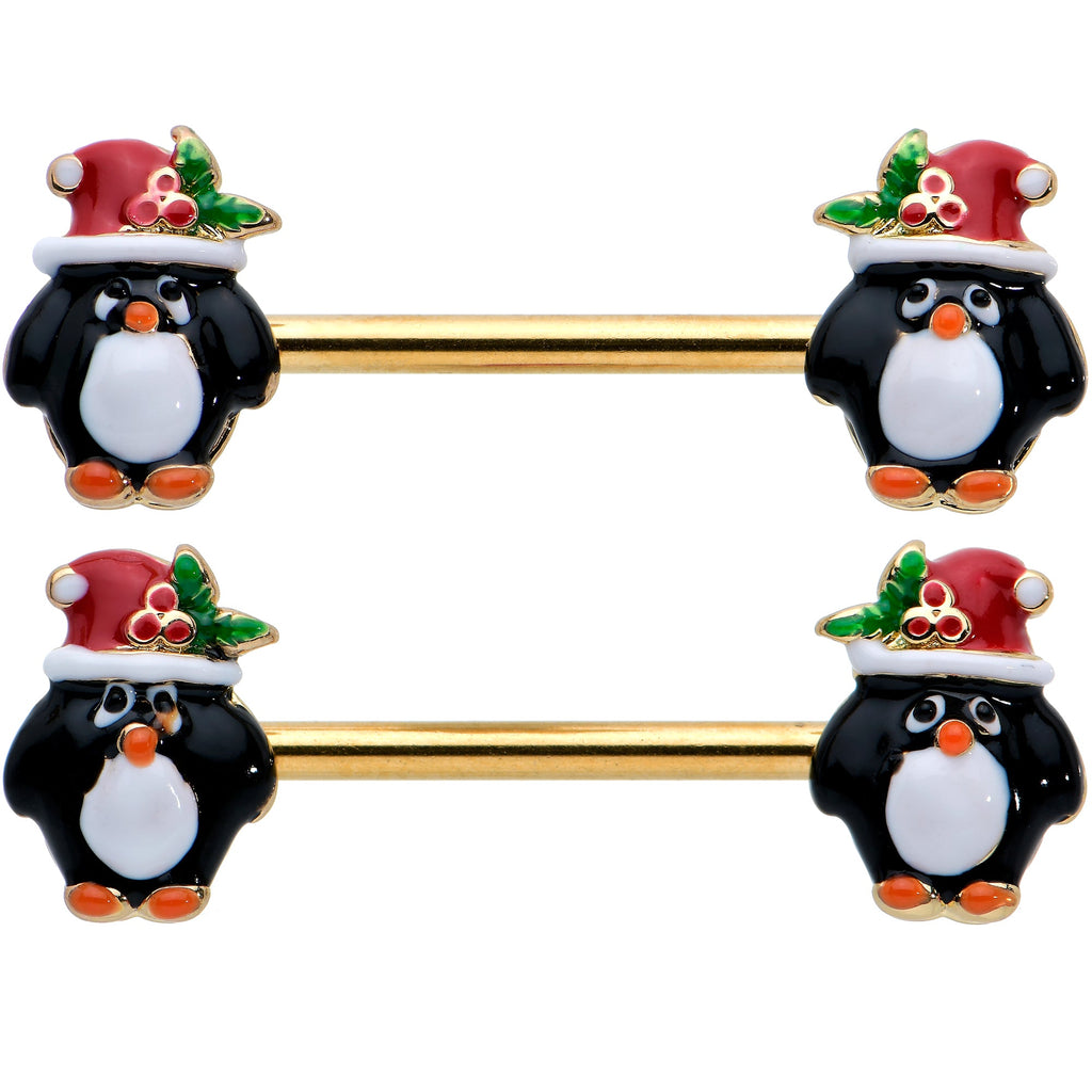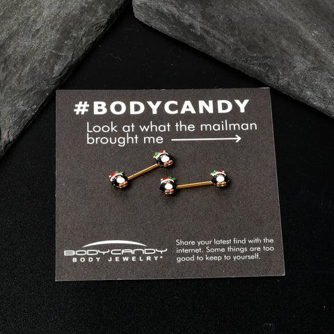 14G 9/16 Gold Tone Holly Hat Penguin Barbell Nipple Ring Set