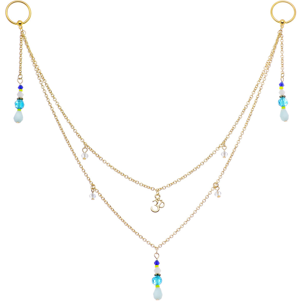 14 Gauge 9/16 Gold Tone Om Blue Beads Captive Ring Dangle Nipple Chain