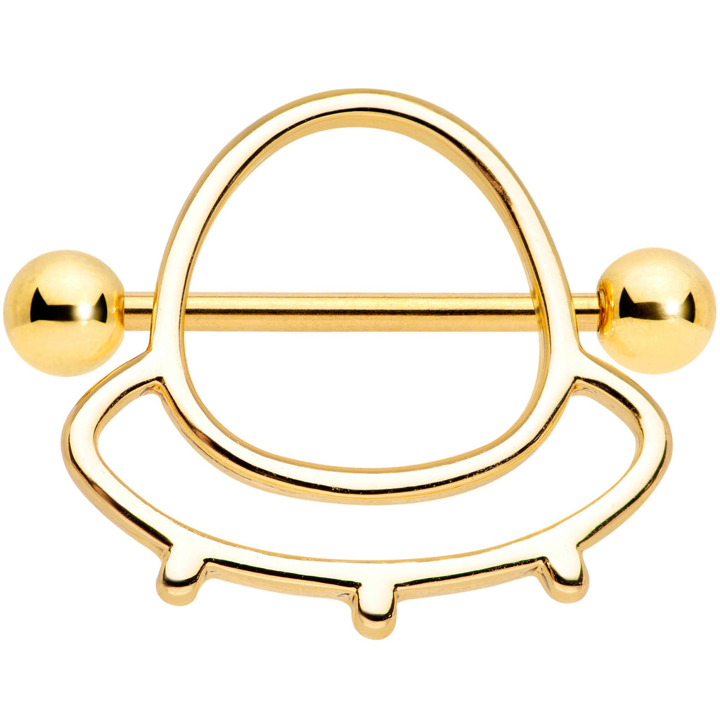 Finish your look with something (inter)stellar when you wear this 14 gauge nipple jewelry! It's made with 14mm gold tone PVD over 316L surgical grade stainless steel straight barbells with 5mm ball ends. The shield portion is made in the shape of a UFO from out of this world. With this jewelry in your nipple piercings, you'll be seeing stars! Sold as a set of two.Specifications