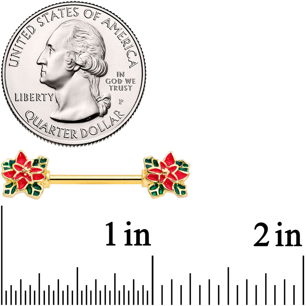 Just because it's the winter holiday season doesn't mean we can't still have colorful flowers, like with this 14 gauge nipple jewelry! It's made with 14mm gold tone PVD over 316L surgical grade stainless steel straight barbells. The ends feature gorgeous holiday poinsettia charms with deep green leaves and a bright red blossom. Since this flower doesn't need watering, you can wear it for Christmas and any other time of year too! That's a flower that's festive and still super functional! Sold as a set of two.Specifications