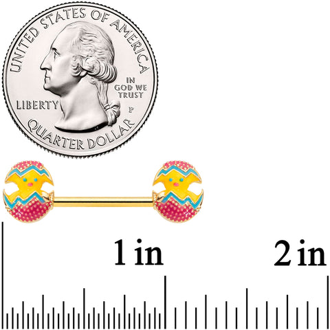 These chicks are entering the world in style on this 14 gauge nipple jewelry! It's made with 14mm gold tone PVD over 316L surgical grade stainless steel straight barbells. Each of the ends features an Easter chick, hatching from its egg. The eggs feature stripes of red and blue, with textured detailing. The chicks are yellow with orange beaks and blue eyes for a cohesive appearance. These little honeys have hatched and they're ready to rock for Easter on these sweet and stylish nipple piercing rings! Sold as a set of two.Specifications