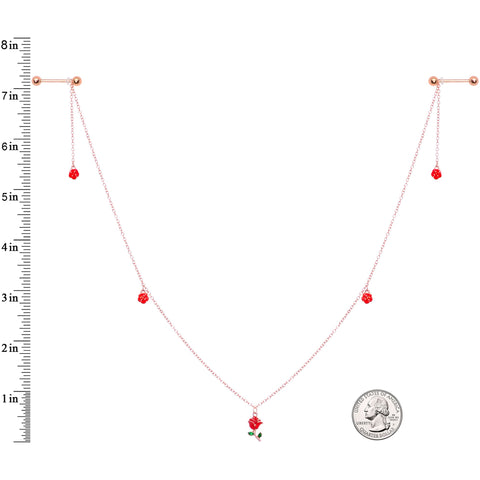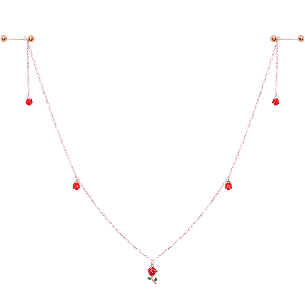 Get ready to celebrate Valentine's Day with your lover any time you like with this pretty 14 gauge dangle nipple jewelry! Made with 14mm gold tone plated over 316L surgical grade stainless steel straight barbells, these nipple piercings feature a 14" maximum length rose gold tone chain whose position can be adjusted with o-rings and romantic red rose flower dangle charms. Your partner will be hypnotized, but not by your eyes!Specifications