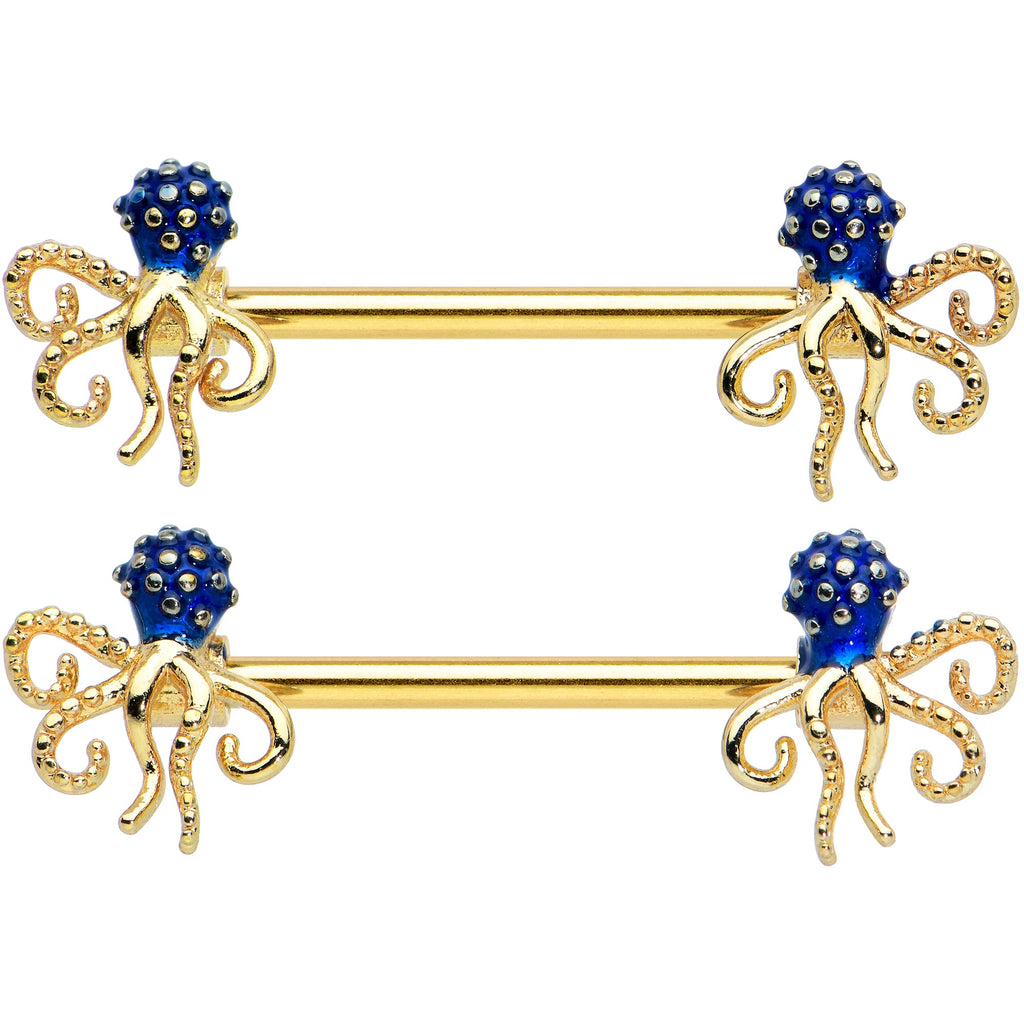 Give your nipple piercings some nautical flair with this 14 gauge nipple jewelry! It's made with 14mm gold tone PVD over 316L surgical grade stainless steel straight barbells. Each of the ends features an octopus charm, heavily embellished with textured detailing. They're further embellished with deep blue coloring for an added splash of contrast. Give your nipple piercings eight times the style with these charming octopus nipple rings. Sold as a set of two.Specifications