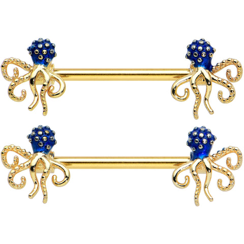 14 Gauge 9/16 Gold Tone Textured Blue Octopus Barbell Nipple Ring Set