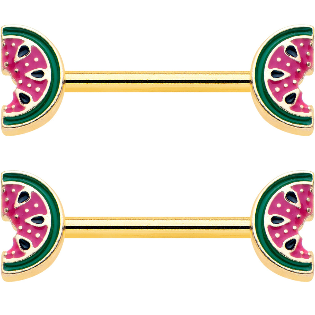 14 Gauge 9/16 Gold Tone Watermelon Bite Barbell Nipple Ring Set