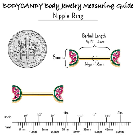Take a bite of style with this tasty 14 gauge nipple jewelry. It is made with 14mm gold tone PVD over 316L surgical grade stainless steel straight barbells. Each of the ends features a watermelon slice charm, inlaid in red and green with black seed embellishments. The tasty fruits even have a bite already taken out. You too will find these yummy melon nipple piercing rings irresistible. Sold as a set of two.