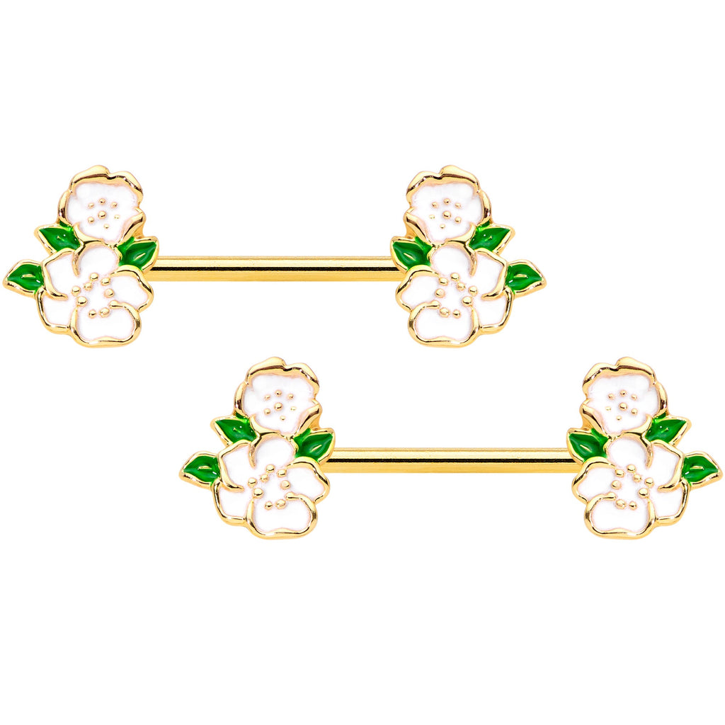 You'll feel absolutely floral with this elegant flower 14 gauge nipple jewelry! It's made with 14mm gold tone PVD over 316L surgical grade stainless steel straight barbells. Each of the ends features a white flower charm that screams spring. They're embellished with green leaves for an added touch of realism. Between the luscious color contrast and splashy styling, these flowers are sure to make an impression! Sold as a set of two.