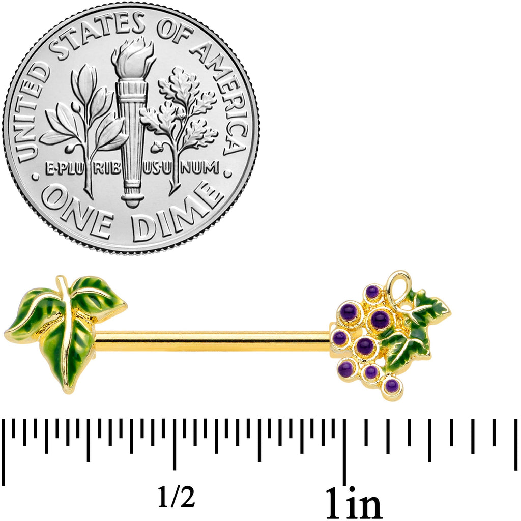 If you're a fruit fanatic or wild about wine, this 14 gauge nipple jewelry has you covered! It's made with 14mm gold tone PVD over 316L surgical grade stainless steel straight barbells. One end features a big bunch of grapes charm embellished with green and purple for a look of true realism. The other end features deep green leaves. Grab a bunch of grapes for your nipple piercings - this fruit is fabulous! Sold as a set of two.Specifications