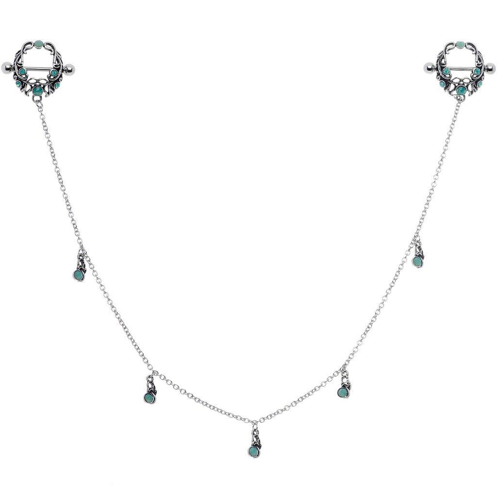 The elegantly scrolling details on this 14 gauge nipple jewelry are sure to please! It's made with 14mm durable 316L surgical grade stainless steel straight barbells with 5mm ball ends. The shield charms have a 1/2" rise and an openwork design set with green faux opals. Dangling between the two shields is a 12" chain that features matching green faux opals dangle charms.