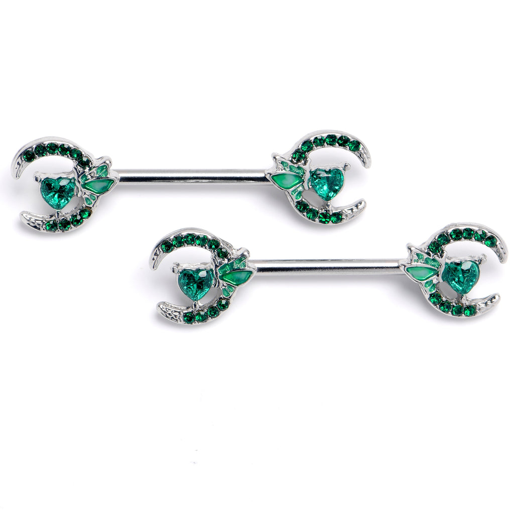 Love your piercings all the way to the moon with this elegant 14 gauge nipple jewelry. It is made with 14mm durable 316L surgical grade stainless steel straight barbells. Each of the ends features a crescent moon charm paved with small green gems. Set on the side of each moon is a green gem heart embellishment, with green inlaid butterfly wings. These moons will be the star of your collection with these celestial nipple piercing rings. Sold as a set of two.Specifications