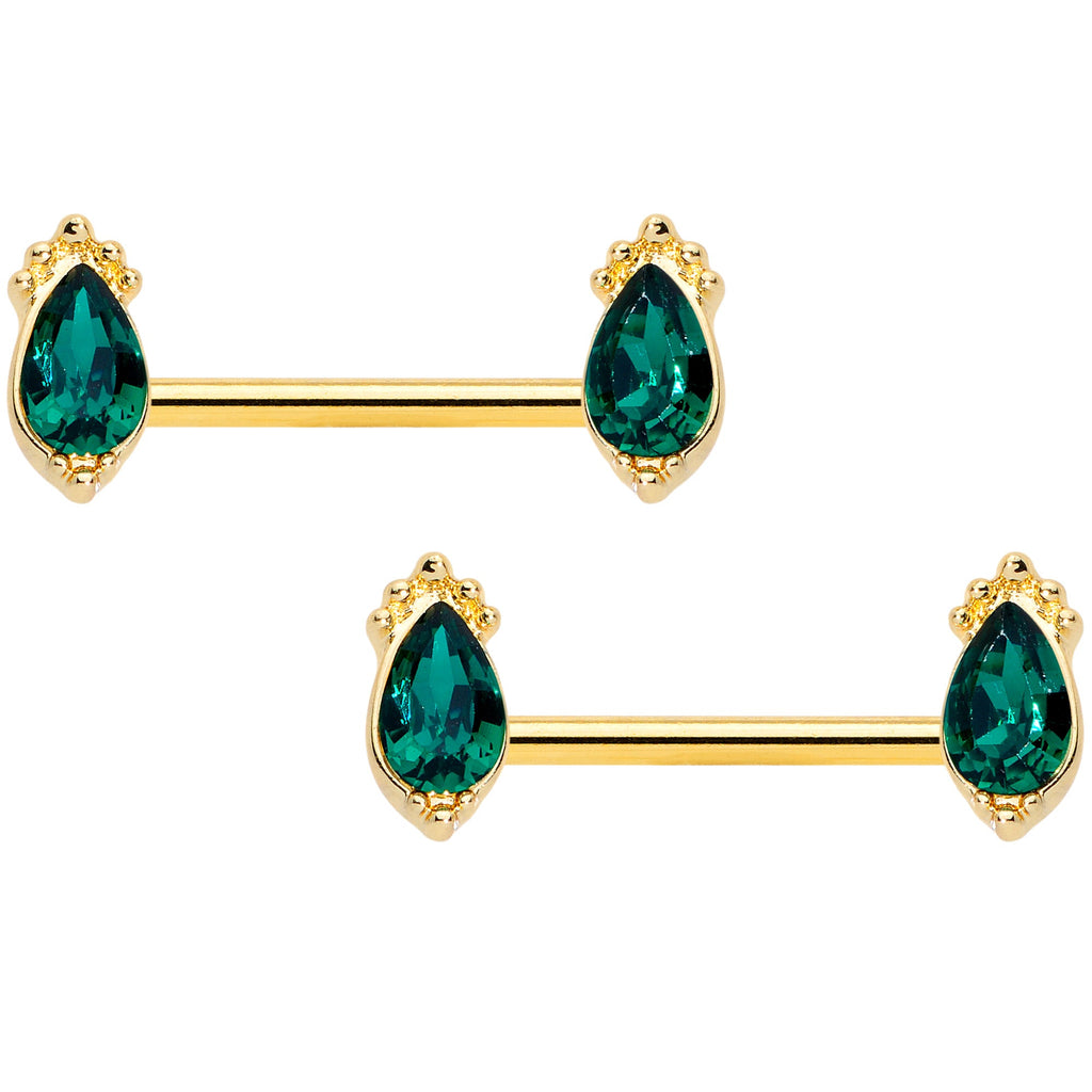 This 14 gauge nipple jewelry combines colors and simple shapes for a feel that's somehow gala and luxurious all at once. It's made with 14mm gold tone PVD over 316L surgical grade stainless steel straight barbells. The ends feature drop-shaped gems in a rich deep green, making for a color combination that's absolutely luscious. Whether you're headed for a sumptuous soiree or simply want a look of simple elegance, you'll get both with these stunning nipple rings! Sold as a set of two.Specifications