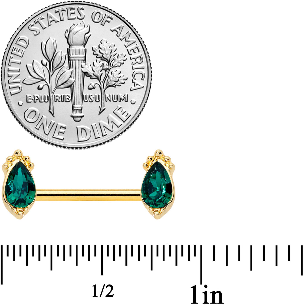 14 Gauge 9/16 Green Gem Gold Tone Drop Barbell Nipple Ring Set