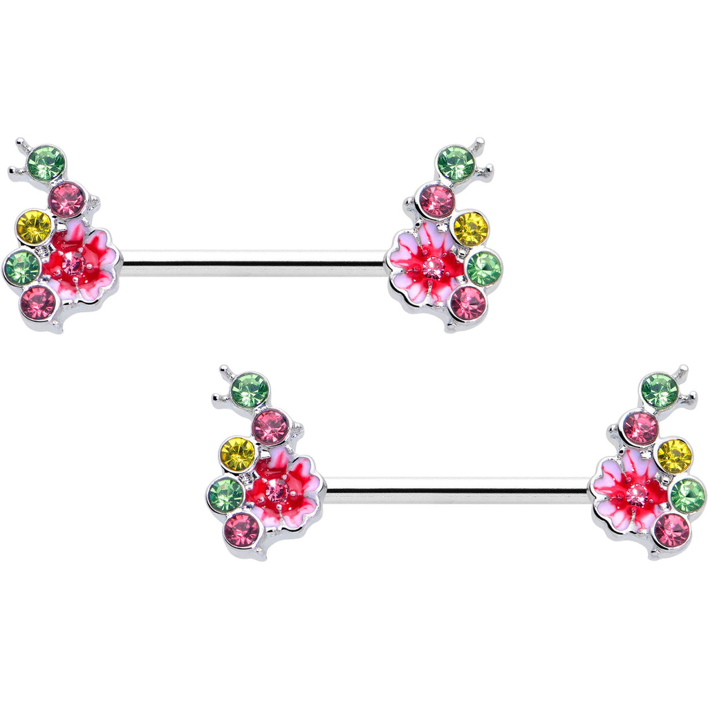 Get hungry for floral fabulousness with the caterpillars on this 14 gauge nipple jewelry. It is made with 14mm durable 316L surgical grade stainless steel straight barbells. Each of the ends features a flower charm, inlaid in shades of pink and set with pink gems at the centers. At one side of the flowers are caterpillars, composed entirely of green, pink, and yellow gems. Conjure a whimsical new style with these insect and floral nipple piercing rings. Sold as a set of two.Specifications