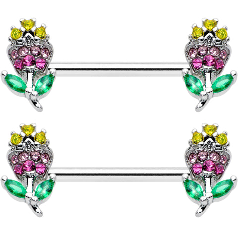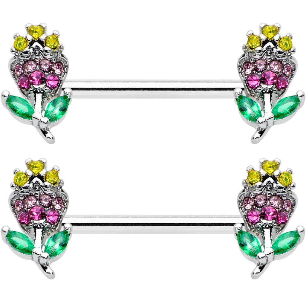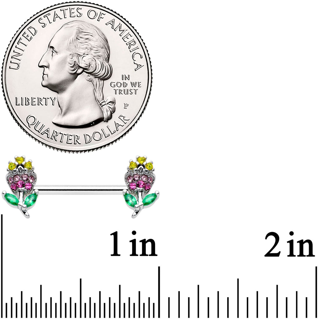 Grab your beads and get ready to party with this 14 gauge nipple jewelry! It's made with 14mm durable 316l surgical grade stainless steel straight barbells. Each of the ends features a flower charm, with green gem leaves. The flowers have blossom set with pink gems in different shades and are crowned with yellow gems for a totally festive look! You'll be ready to rule the French Quarter with these fabulous flower nipple piercing rings! Sold as a set of two.