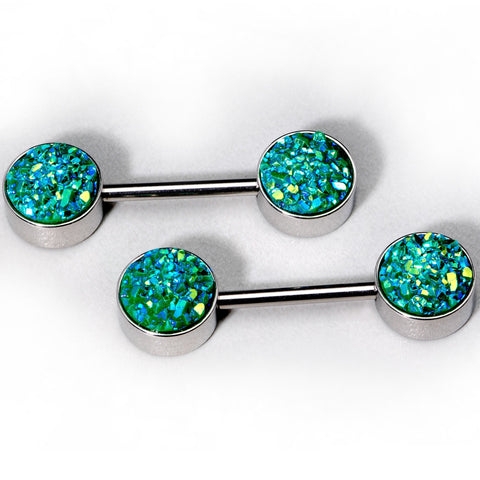 14 Gauge 9/16 Green Synthetic Druzy Garden Barbell Nipple Ring Set