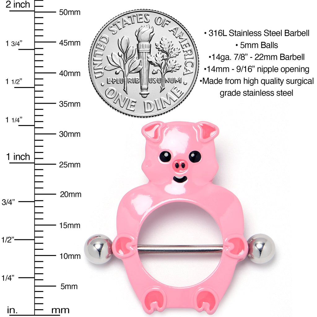 You're sure to go hog wild over this 14 gauge nipple jewelry. It's made with 14mm durable 316L surgical grade stainless steel straight barbells with 5mm ball ends. The shield portion is pink, with the pig's feet embellishing it at the bottom and center. The top features the pig's face, with darker pink ears, and a friendly, smiling expression. Let your nipple piercings get porked with these fabulous farmyard-themed nipple piercing shields. Sold as a set of two.