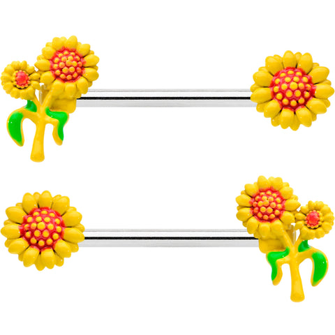 The sun is out...and it's brought some friends on this 14 gauge nipple jewelry! It's made with 14mm durable 316L surgical grade stainless steel straight barbells. They feature a double yellow sunflower charm with textured detailing at their centers. They're further embellished with a pair of green leaves while the opposite end features a single sunflower charm in full bloom. Make every day a sunny day with these striking sunflower nipple piercing rings! Sold as a set of two.Specifications