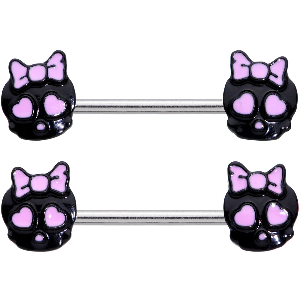 The skulls on this 14 gauge nipple jewelry are total sweeties! It's made with 14mm durable 316L surgical grade stainless steel straight barbells. Each of the ends features a black skull charm. The skulls each features a pink bow on their heads and matching pink heart-shaped eyes for a look that transforms them from creepy to cute. Take your nipple piercings from "alarming" to "adorable" with these cute and captivating skull nipple rings! Sold as a set of two.