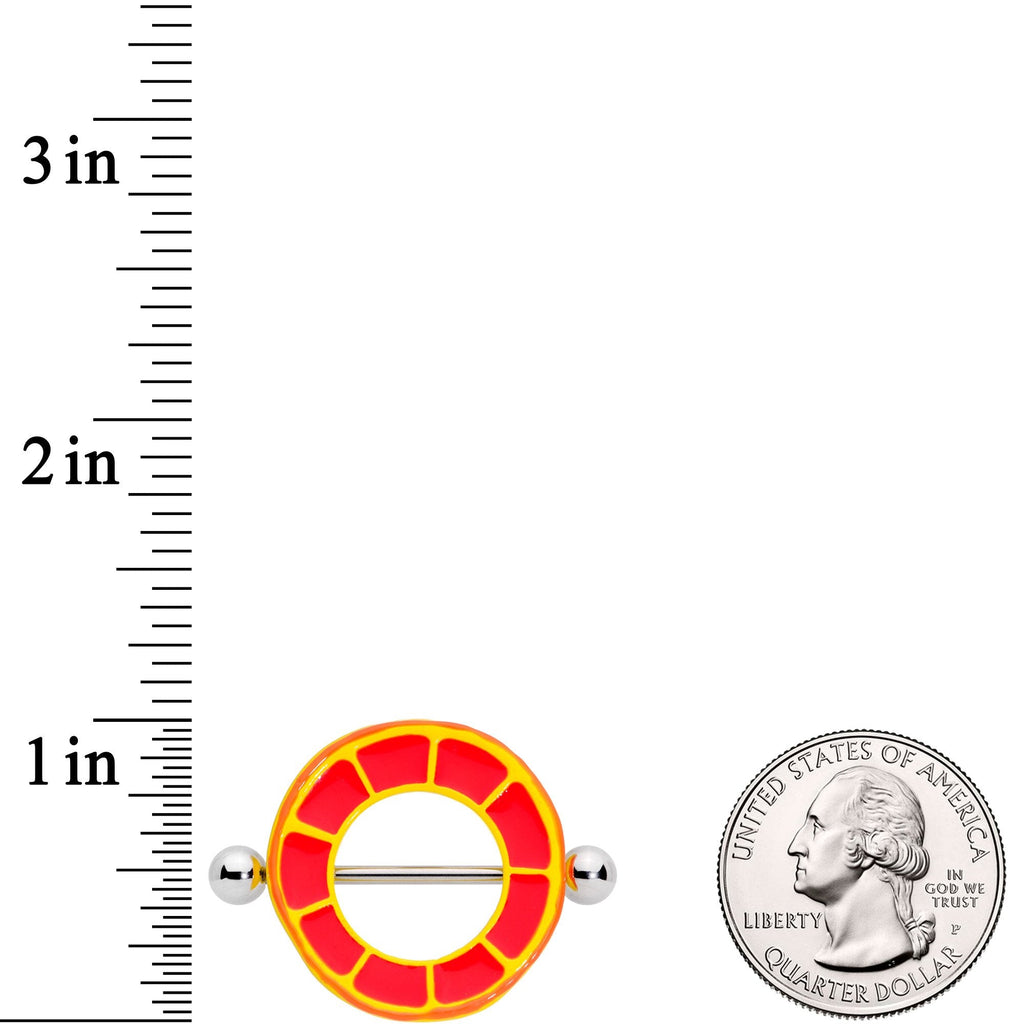 Mmm, tasty! Nothing is sweeter than these freshly picked nipple shields. Looking like fresh orange slices, they feature a 14 gauge durable 316L surgical grade stainless steel straight barbell that measures 14mm in length. They have a width and a rise of 13mm each for a comfortable fit. Remember, nothing beats the winter blahs better than some juicy oranges except some juice orange nipple shields! Sold as a pair.Specifications