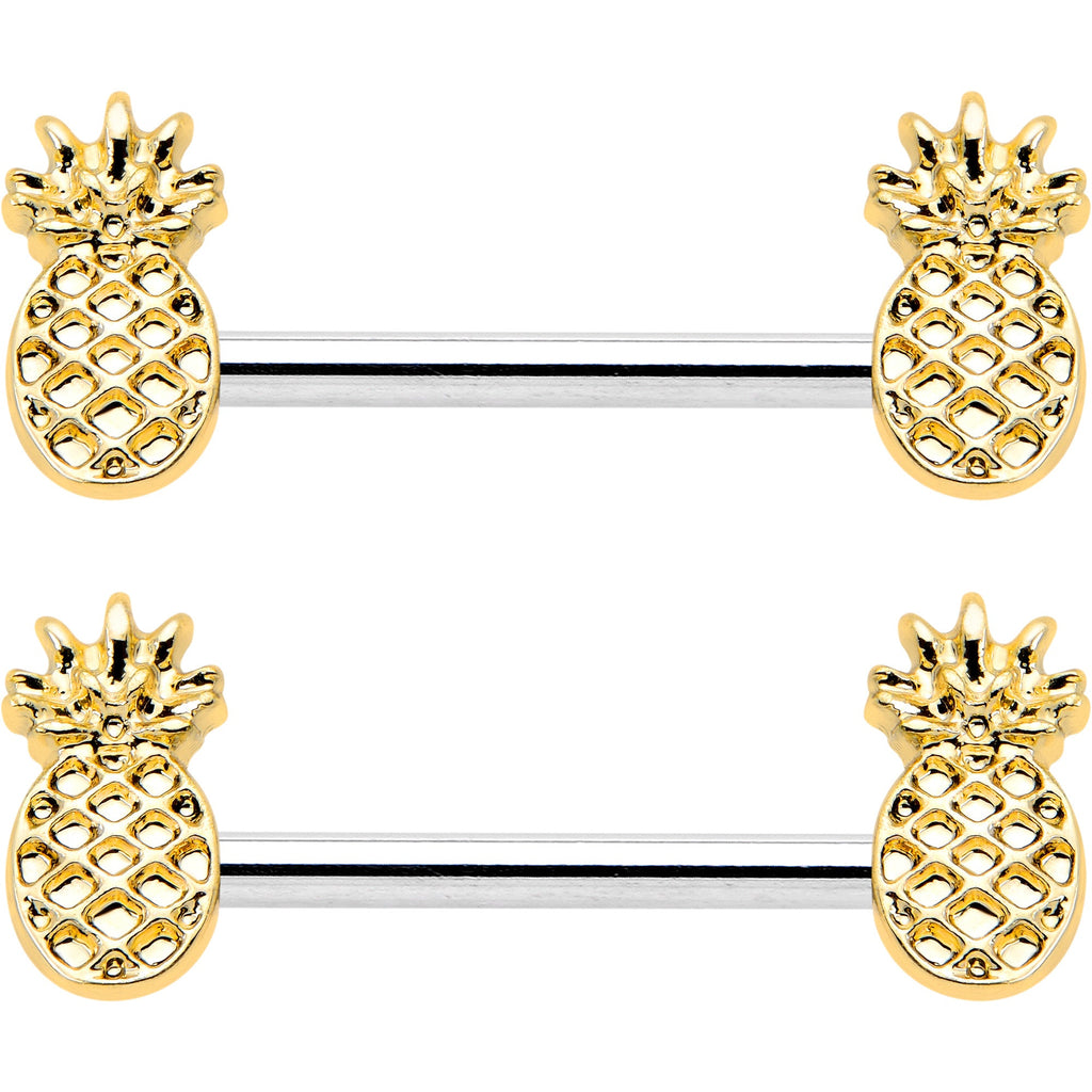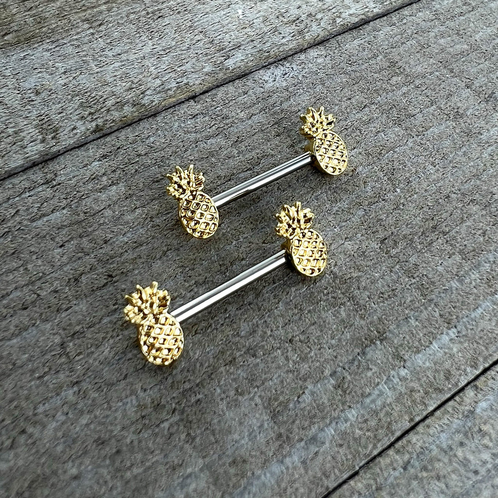 Add some tropical swing to your thing with these 14 gauge nipple piercing rings! They're made with 14mm durable 316L surgical grade stainless steel straight barbells. Each of the ends features a gold tone pineapple charm, with cutout detailing for a light and lacy effect. Your nipple piercings will be looking downright delicious with this yummy pineapple nipple jewelry! Sold as a set of two.