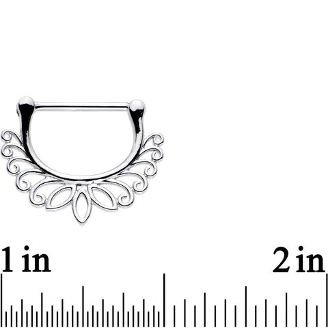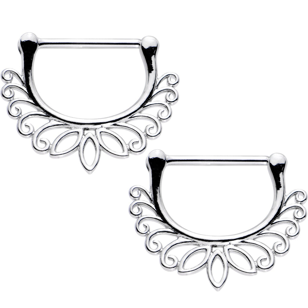 Dress up your breasts with this pair of perfectly lovely flower-inspired 14 gauge nipple rings. Made with 14mm durable 316L surgical grade stainless steel hinged straight barbells, this pair of nipple piercings features a 15mm width and 10mm rise as well as a lotus style series of leaves along the bottom rim and is sold as a set of two for you!