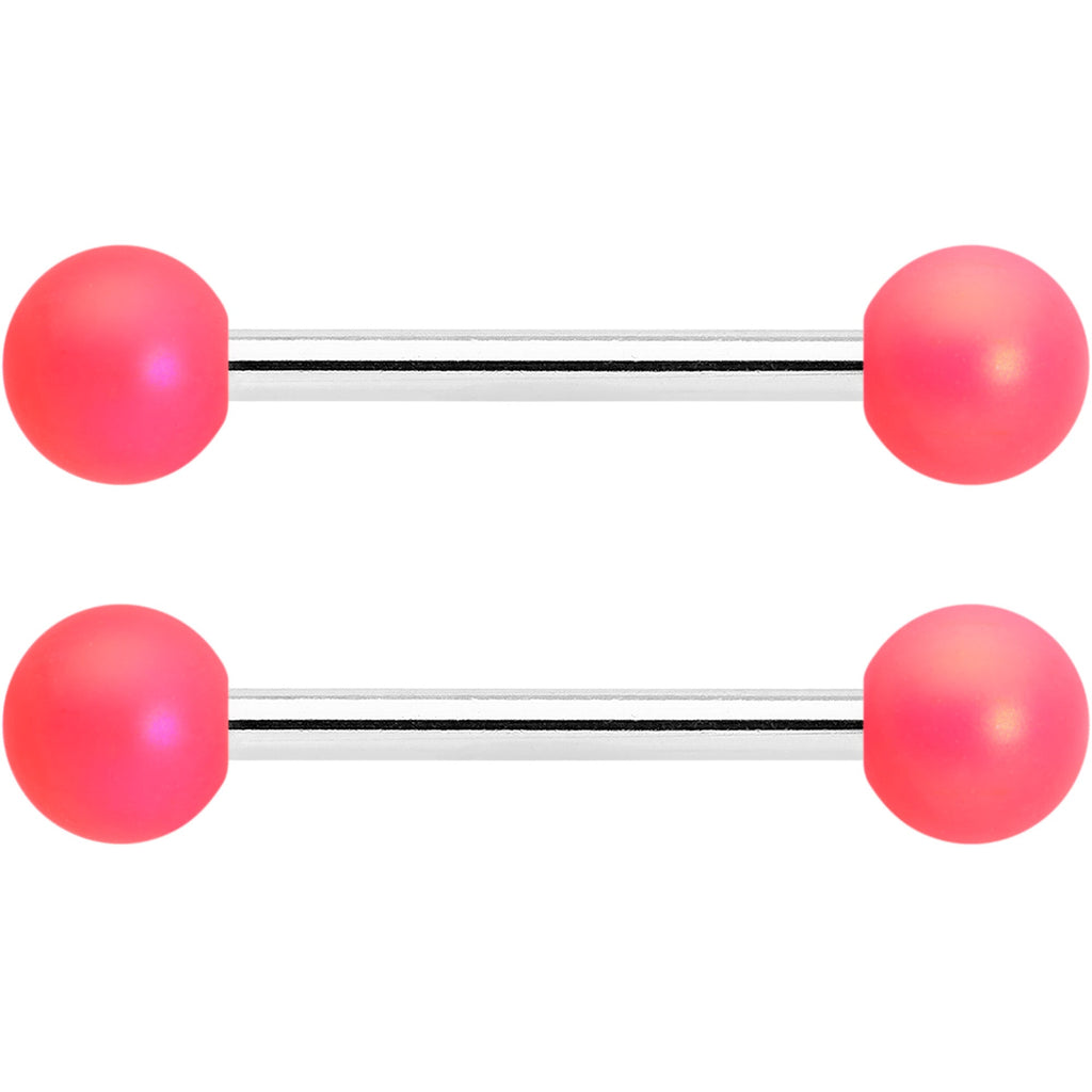 Don't let your look fall flat when you can go matte - like with this 14 gauge nipple jewelry! It's made with 14mm durable 316L surgical grade stainless steel straight barbells. Each one features 4mm ball ends, which are made with pink acrylic and feature a color-shift effect that can make them appear aurora as well. They're further embellished with a matte finish for a truly stylish look. You'll be mad about matte with these understated nipple piercing rings! Sold as a set of two.Specifications