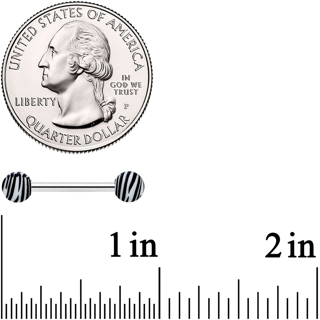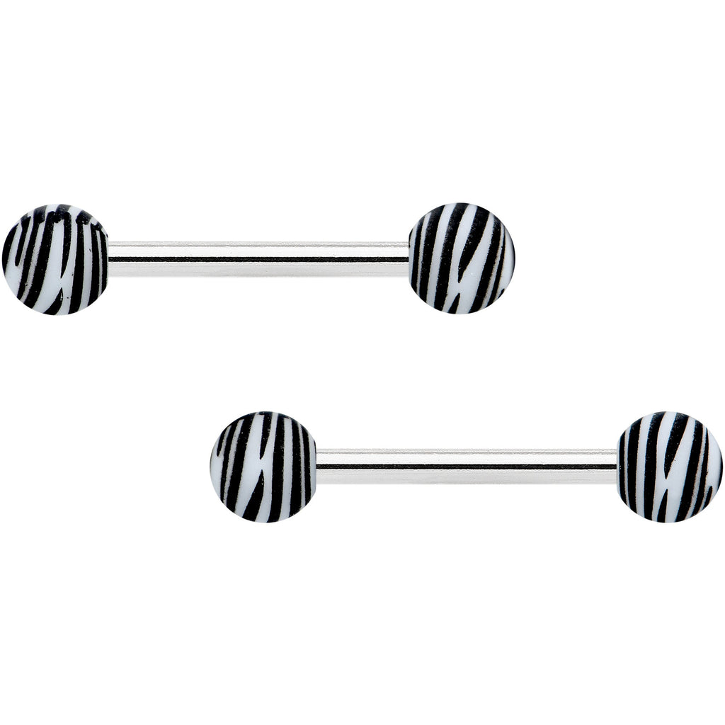 Add some zany zebra style to your look with this 14 gauge nipple jewelry! It's made with 14mm durable 316L surgical grade stainless steel straight barbells with 4mm ball ends. The ball ends are made with acrylic and feature a white and black zebra-striped pattern. They also feature a matte finish for a look that stands out without overwhelming. You'll definitely love the look of this nipple piercing jewelry! Sold as a set of two.Specifications