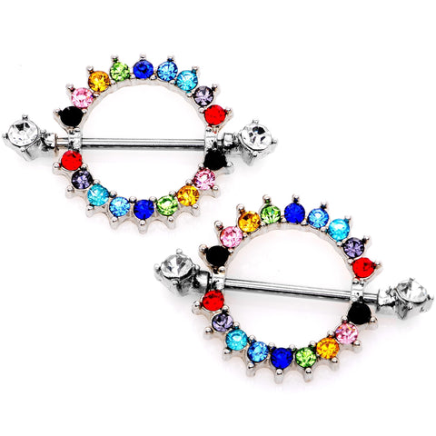 Surround your nipple piercings with a rainbow halo with these 14 gauge shields! These are 14mm barbells with a ring of gems in multiple colors like a proper rainbow should have! They are 10mm width with a rise of 9mm for a perfect fit and feature durable 316L surgical grade stainless steel straight barbells. Instead of a pot of gold, our shields feature clear gems on the ends of the barbell for even more pizazz! Sold as a set of two.Specifications
