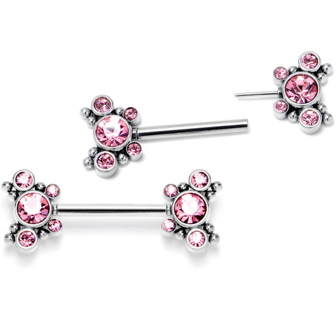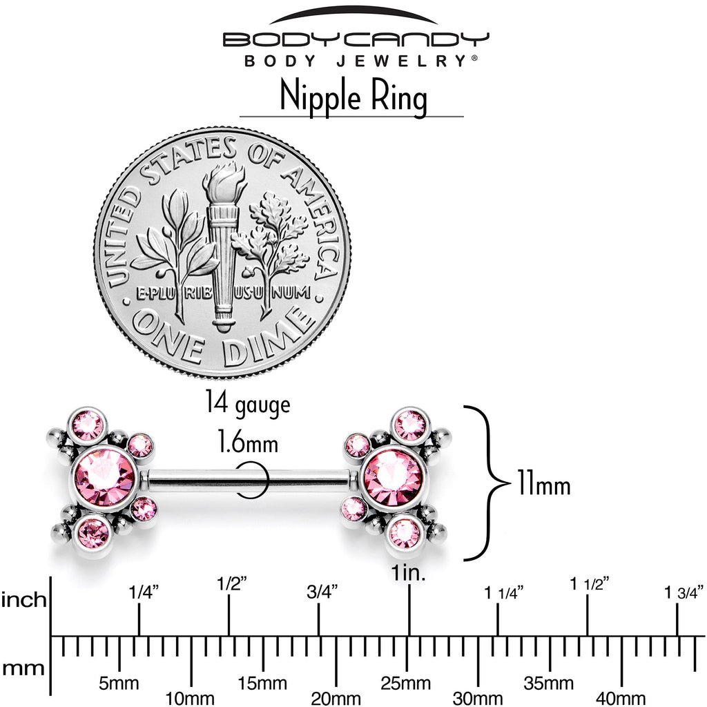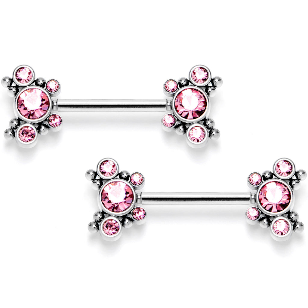 Simple style that goes with everything is what you get with with these 14 gauge nipple rings. They are made with 14mm durable 316L surgical grade stainless steel straight barbells. The ends are set with forward facing pink cubic zirconia gems with a quartet of smaller pink cubic zirconia gems surrounding a larger pink cubic zirconia gem. They feature raised detailing and an threadless design for maximum comfort on insertion and removal while keeping a secure fit. Keep it simple while still keeping it stylish with this eternally elegant nipple piercing jewelry. Sold as a set of two.Specifications
