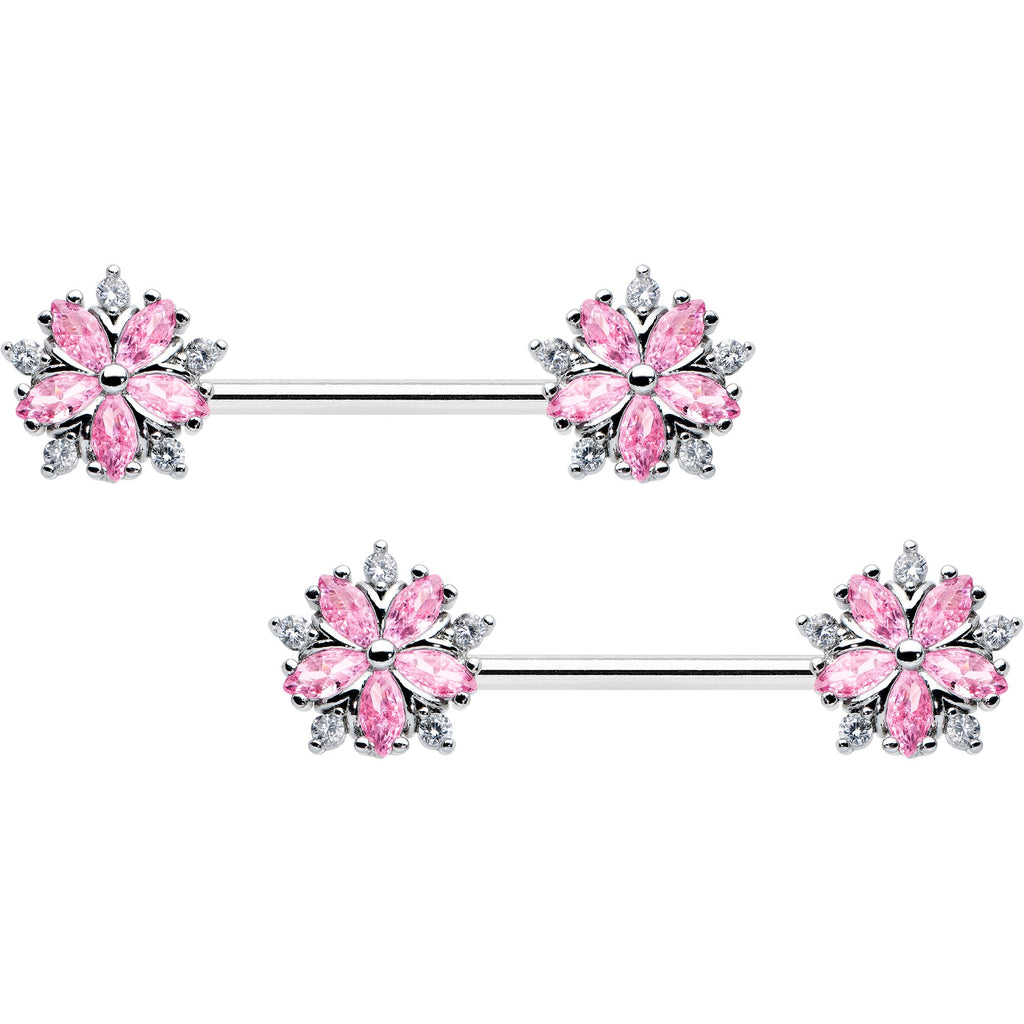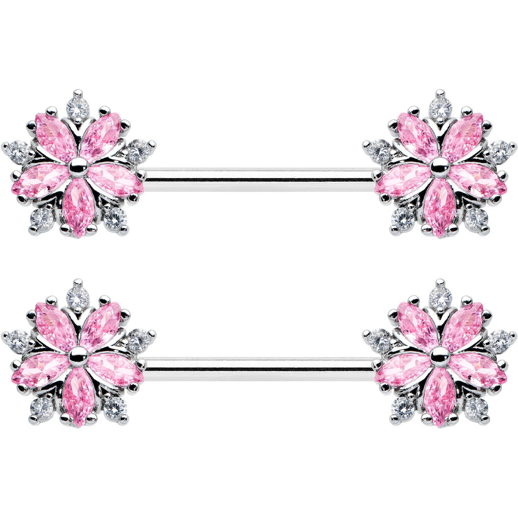 Your nipple piercings will be bursting with style when you're rocking this 14 gauge nipple jewelry! It's made with 14mm durable 316L surgical grade stainless steel straight barbells. Each of the ends features a floral charm, composed of a pink cubic zirconia gem flower. The large petals are in full bloom and the flowers are further embellished with smaller, clear cubic zirconia gems along the edge. Burst into style with these fabulous, flower nipple piercing rings! Sold as a set of two.Specifications