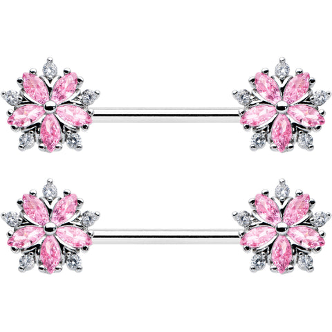 14 Gauge 9/16 Pink CZ Gem Floral Burst Barbell Nipple Ring Set