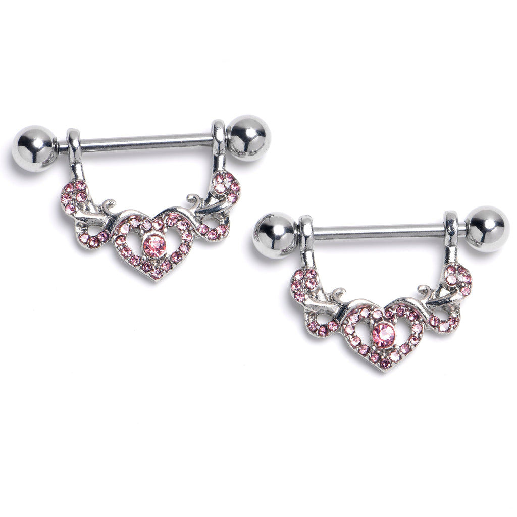 Let love catch you with this 14 gauge nipple jewelry, It is made with 14mm durable 316L surgical grade stainless steel straight barbells with 5mm ball ends. Each barbell supports a heart charm, lavishly set with pink cubic zirconia gems, set between pink cubic zirconia gem embellishments and featuring pink cubic zirconia gems at their centers. You will totally fall in love with these nipple piercing rings. Sold as a set of two.Specifications