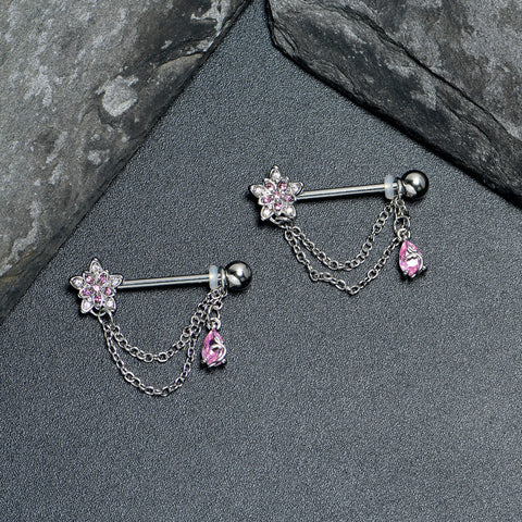 14 Gauge 9/16 Pink CZ Gem Snowflake Flower Chain Dangle Nipple Ring Set
