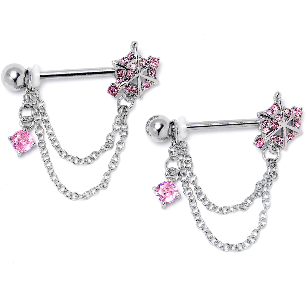 14 Gauge 9/16 Pink CZ Gem Spiderweb Chain Dangle Nipple Ring Set