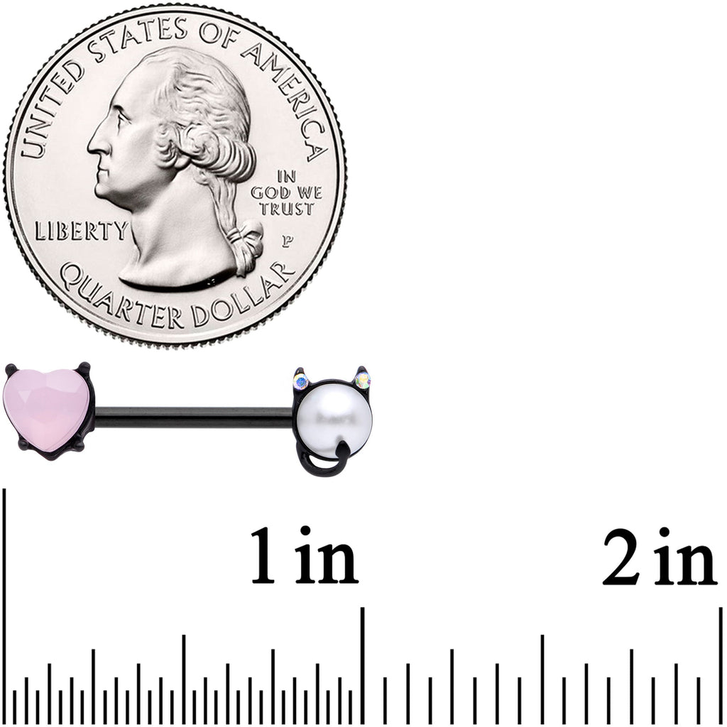 We all try to be good but sometimes it's more fun to be a bit of a devil! These 14 gauge nipple barbells are made with 14mm black PVD over 316L surgical grade stainless steel straight barbells. One end features a white pearlescent orb with aurora gems for horns. It also features a little black tail for extra detailing. The other end is a translucent pink gem heart, which adds a lovely pop of color to the pieces. These devilish little nipple piercings are bound to catch the eye and certain to steal your heart! Sold as a set of two.Specifications