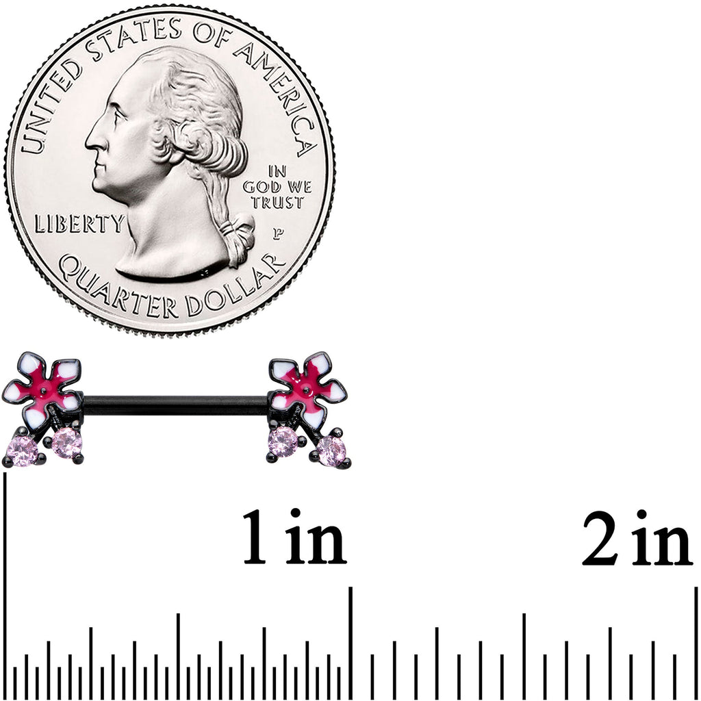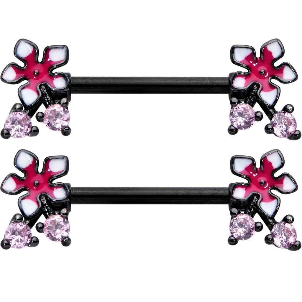 Dream of spring flowers with this 14 gauge nipple jewelry! It's made with 14mm black PVD over 316L surgical grade stainless steel straight barbells. Each of the ends features a flower charm, with pink and white detailing. The flowers are each embellished with a pair of pink gems as well as a whimsical shape. Let your nipple piercings look as fresh as Springtime with these fanciful, floral nipple piercing rings! Sold as a set of two.Specifications