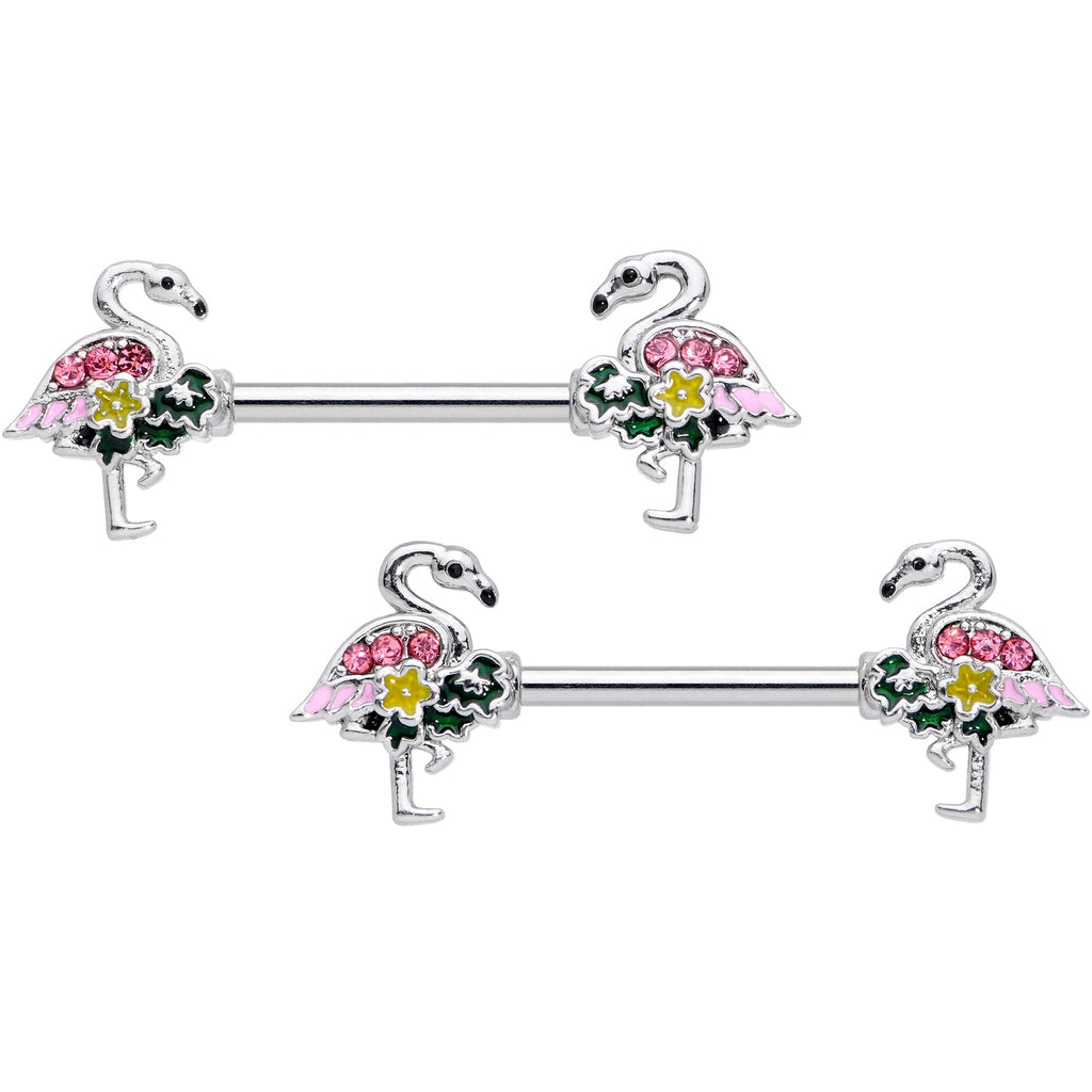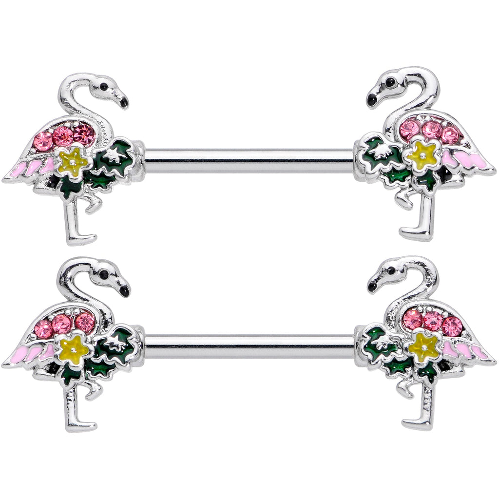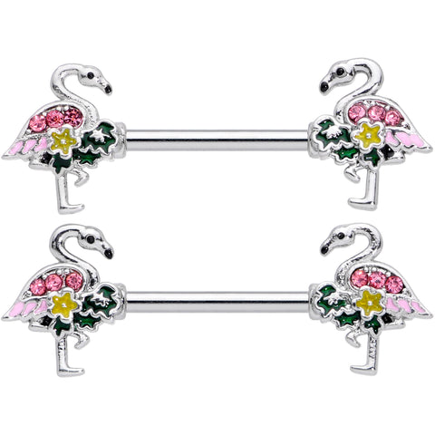 14 Gauge 9/16 Pink Gem Funky Flamingo Barbell Nipple Ring Set