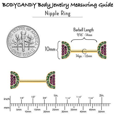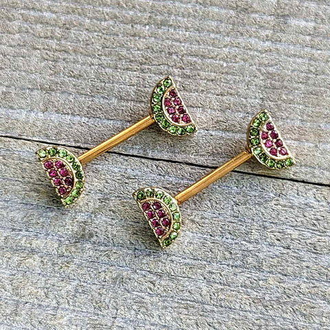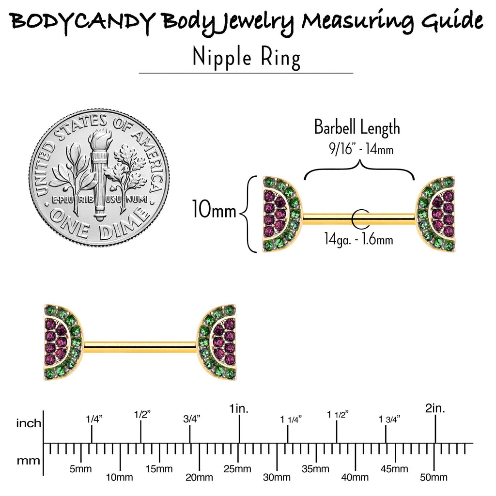 Your nipple piercings will look downright delicious when you are wearing this 14 gauge nipple jewelry. It is made with 14mm gold tone PVD over 316L surgical grade stainless steel straight barbells. Each of the ends features a wedge of watermelon charm, paved in green and pink gems. Get a tasty summer look with these wonderful watermelon nipple piercing rings. Sold as a set of twoSpecifications