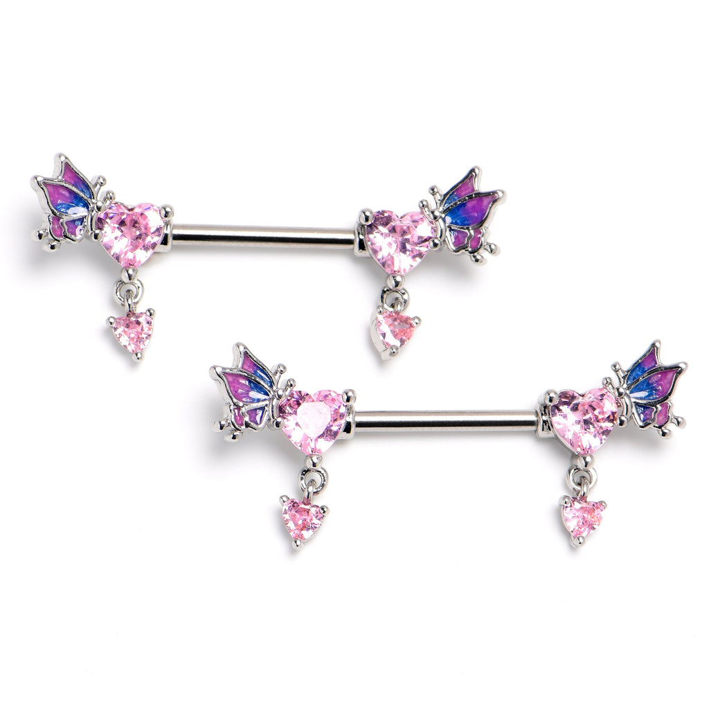 14 Gauge 9/16 Pink Gem Heart Butterfly Purple Dangle Nipple Ring Set