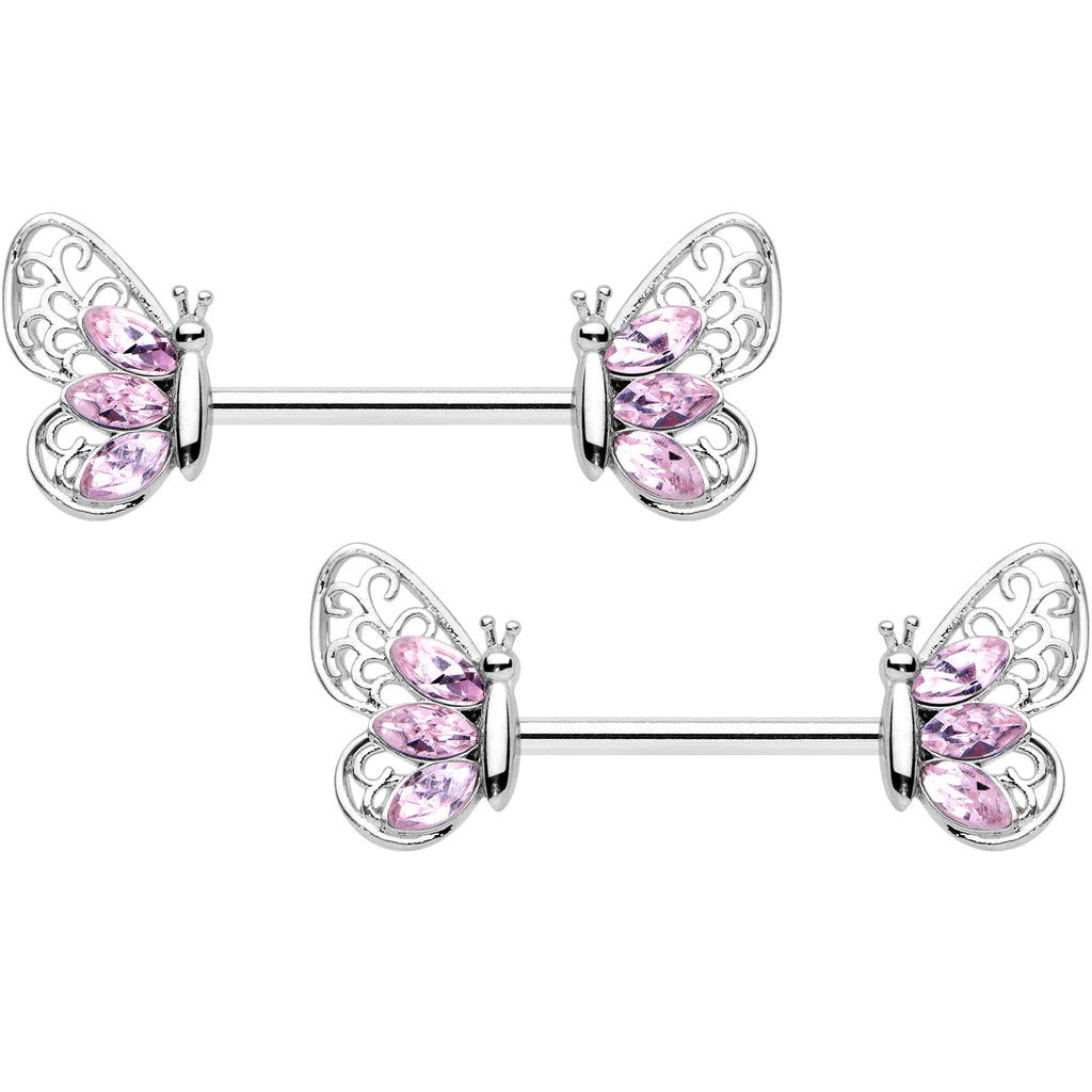 The butterflies on this 14 gauge nipple jewelry almost improve on nature itself! It's made with 14mm durable 316L surgical grade stainless steel straight barbells. Each of the ends features a butterfly charm, set along the center of their wings with pink gems that can't help but catch the eye of any onlooker. The butterflies' wings are open work with lacy patterns running through for a look that's elegant and full of classic style. Let your nipple piercings come out of their cocoons with this visually striking butterfly nipple rings! Sold as a set of two.