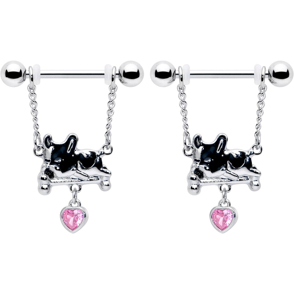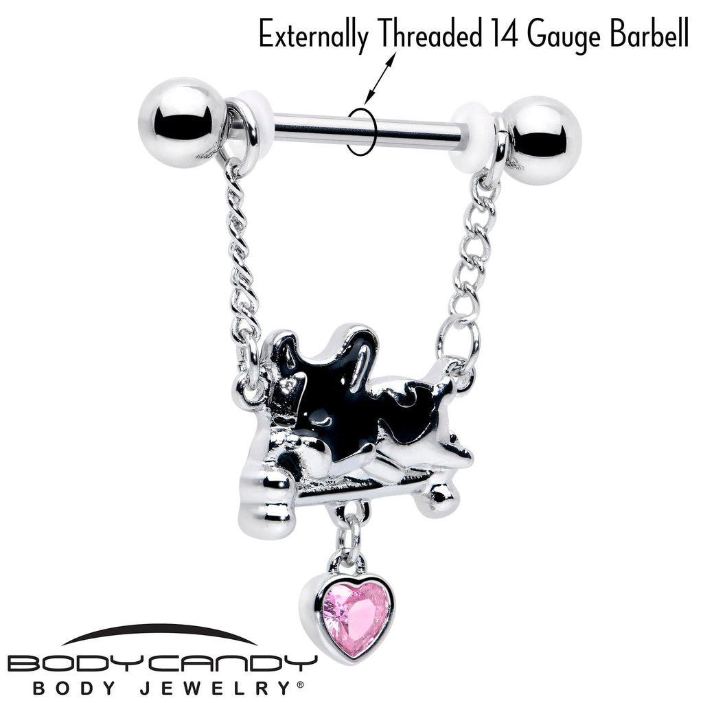 Get comfy and cozy while looking as cute as the dogs on this 14 gauge nipple jewelry. It's made with 14mm durable 316L surgical grade stainless steel straight barbells with 5mm ball ends. Each barbell features a double length of matching chain. Dangling from each pair of chains is a charm of a French Bulldog with graphic black and white colors, snoozing on a bed. Dangling beneath them are pink gem hearts so everyone knows how much you love these popular puppers. You'll be ready to sit and beg for these adorable French Bulldog nipple piercing rings. Sold as a set of two.Specifications