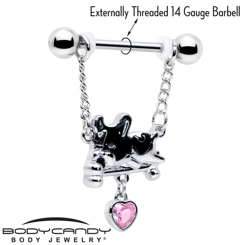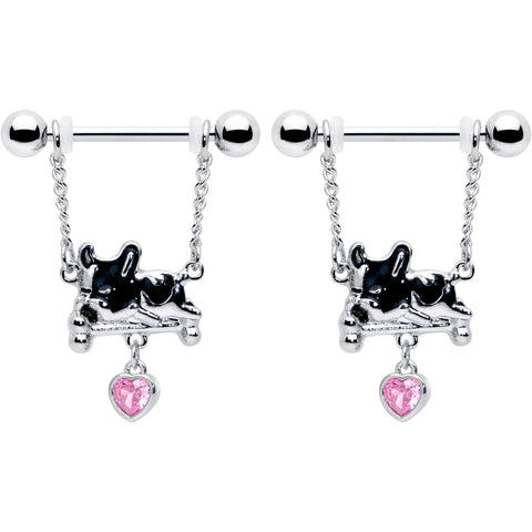 14 Gauge 9/16 Pink Gem Sleepy French Bulldog Chain Dangle Nipple Ring Set