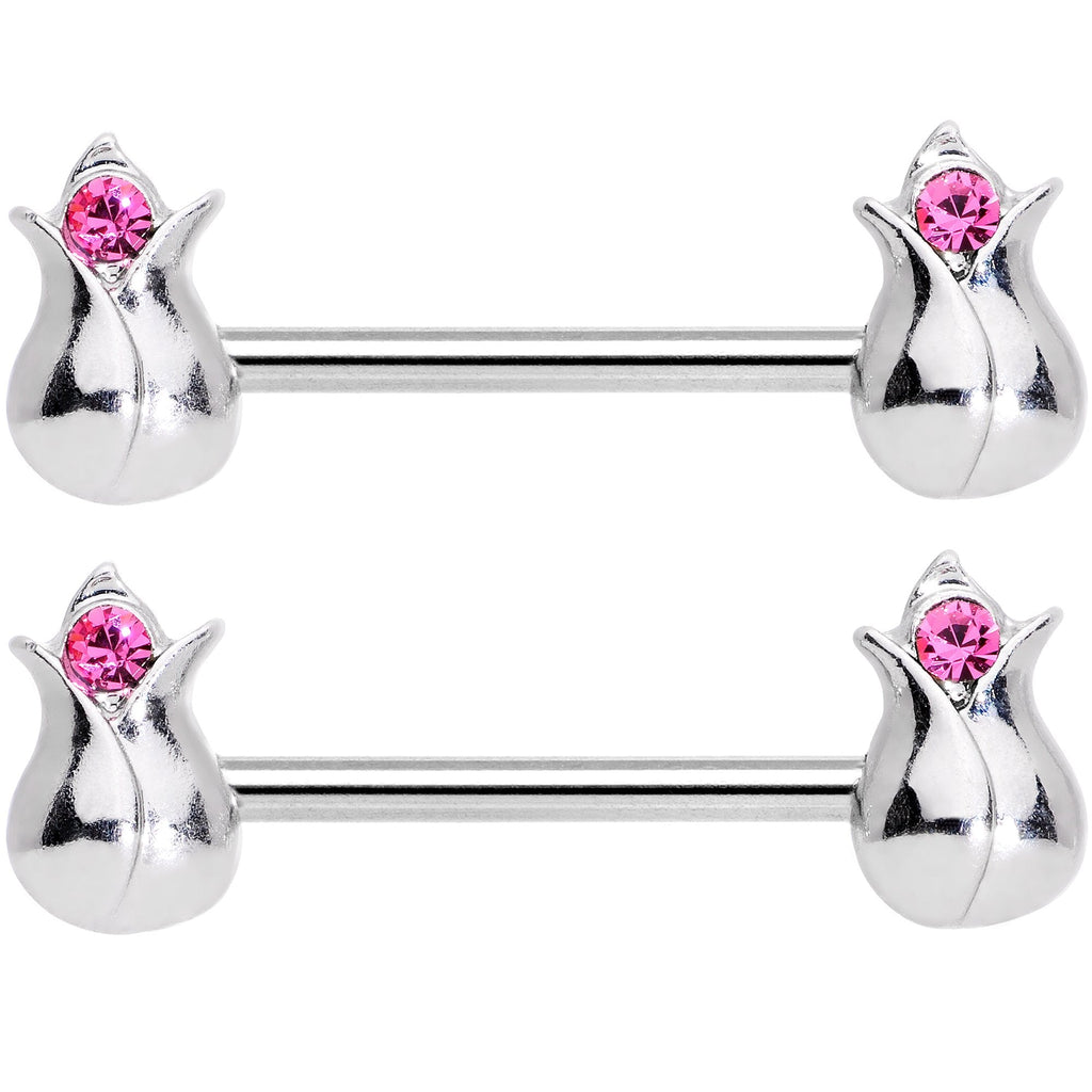 Generally, you have to wait for springtime to enjoy the tulips but now you can enjoy them all year long. Set at their tops with a pink gem, these nipple rings are 14 gauge and made with durable 316L surgical grade stainless steel straight barbells. They are 14mm for the perfect balance of style and subtlety. With these beauties, it's always time for tulips! Sold as a set of two.
