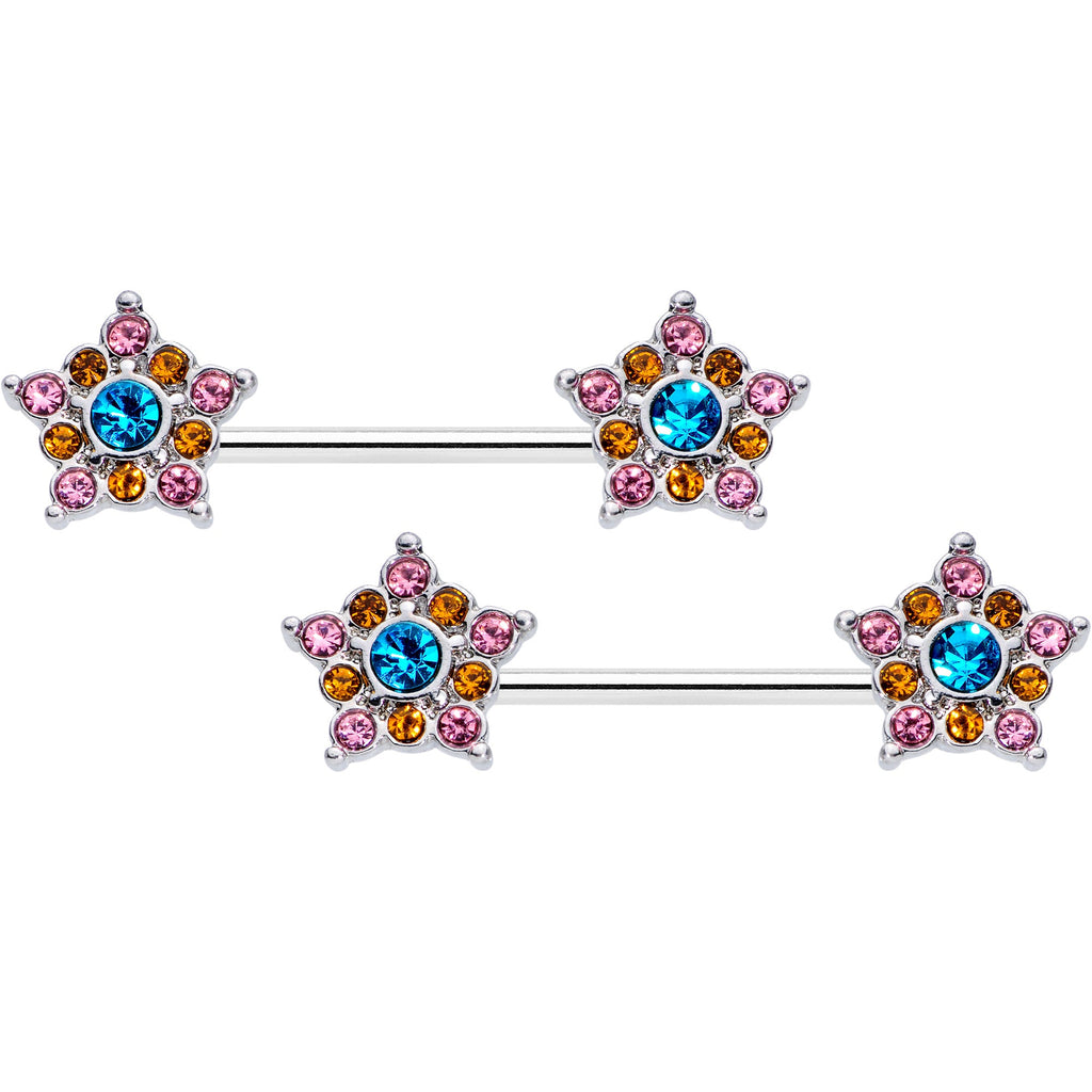 14 Gauge 9/16 Pink Yellow Blue Gem Showy Stars Barbell Nipple Ring Set