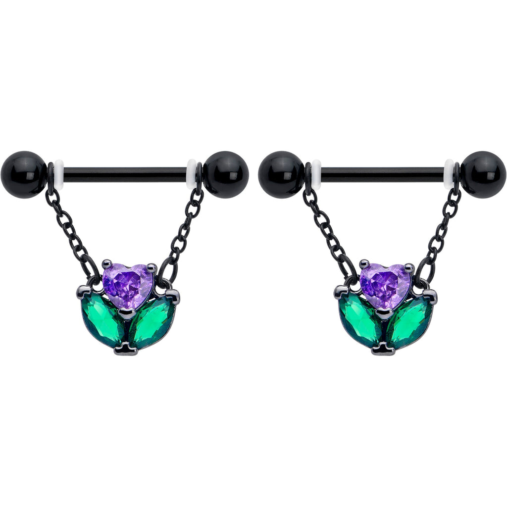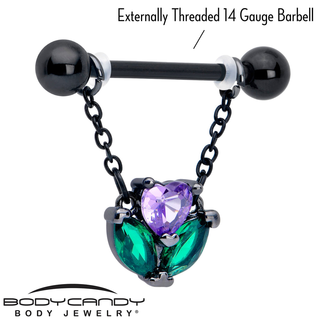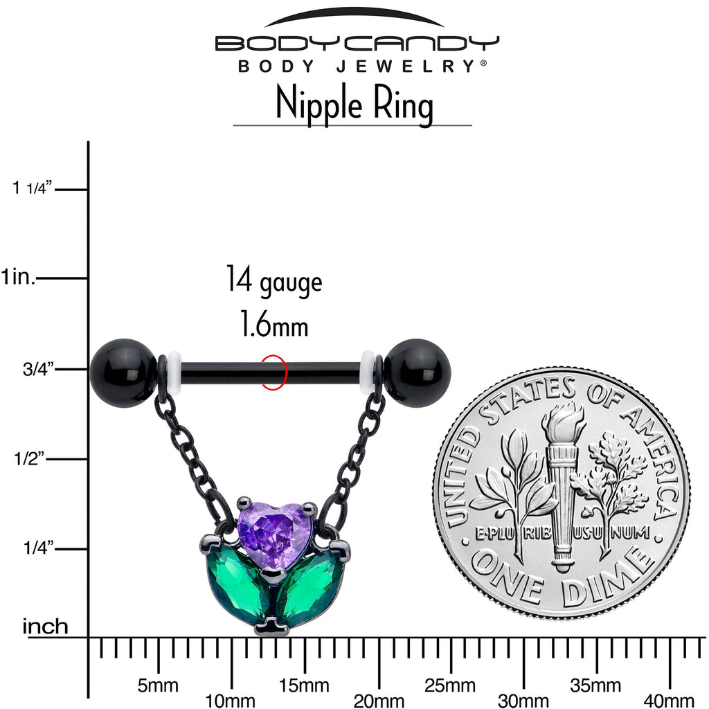 Let love bloom along with your look when you're rocking this 14 gauge nipple jewelry. It's made with 14mm black PVD over 316L surgical grade stainless steel straight barbells with 5mm ball ends. Each barbell supports a double length of matching dangle chain, Dangling from each pair of chains is a flower charm with green cubic zirconia gem leaves. The blossoms are composed of purple cubic zirconia gem hearts for a sweetly romantic touch you can't help but love. Let your love flower in style with these romantic nipple piercing rings. Sold as a set of two.Specifications