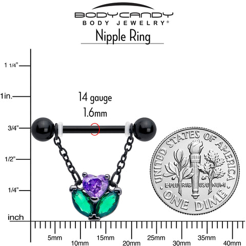 14 Gauge 9/16 Purple CZ Gem Black Love Flower Dangle Nipple Ring Set