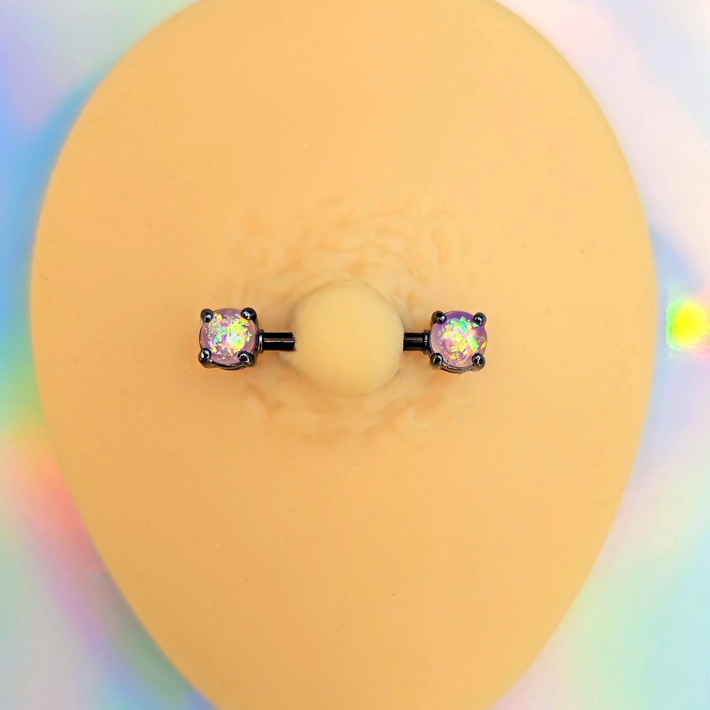 Simple style that goes with everything is what you get with with these 14 gauge nipple rings. They are made with 14mm black PVD over 316L surgical grade stainless steel straight barbells. The ends are set with forward facing purple faux opals for a touch of color and style. They feature an internally threaded design for maximum comfort on insertion and removal, Keep it simple while still keeping it stylish with these eternally elegant nipple rings. Sold as a set of two.Specifications