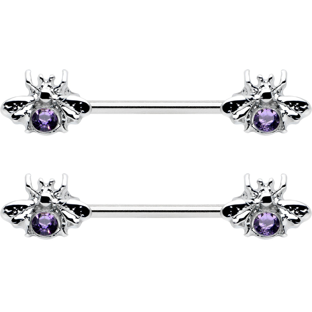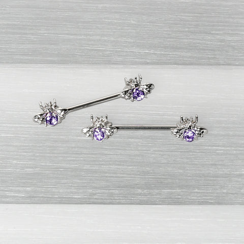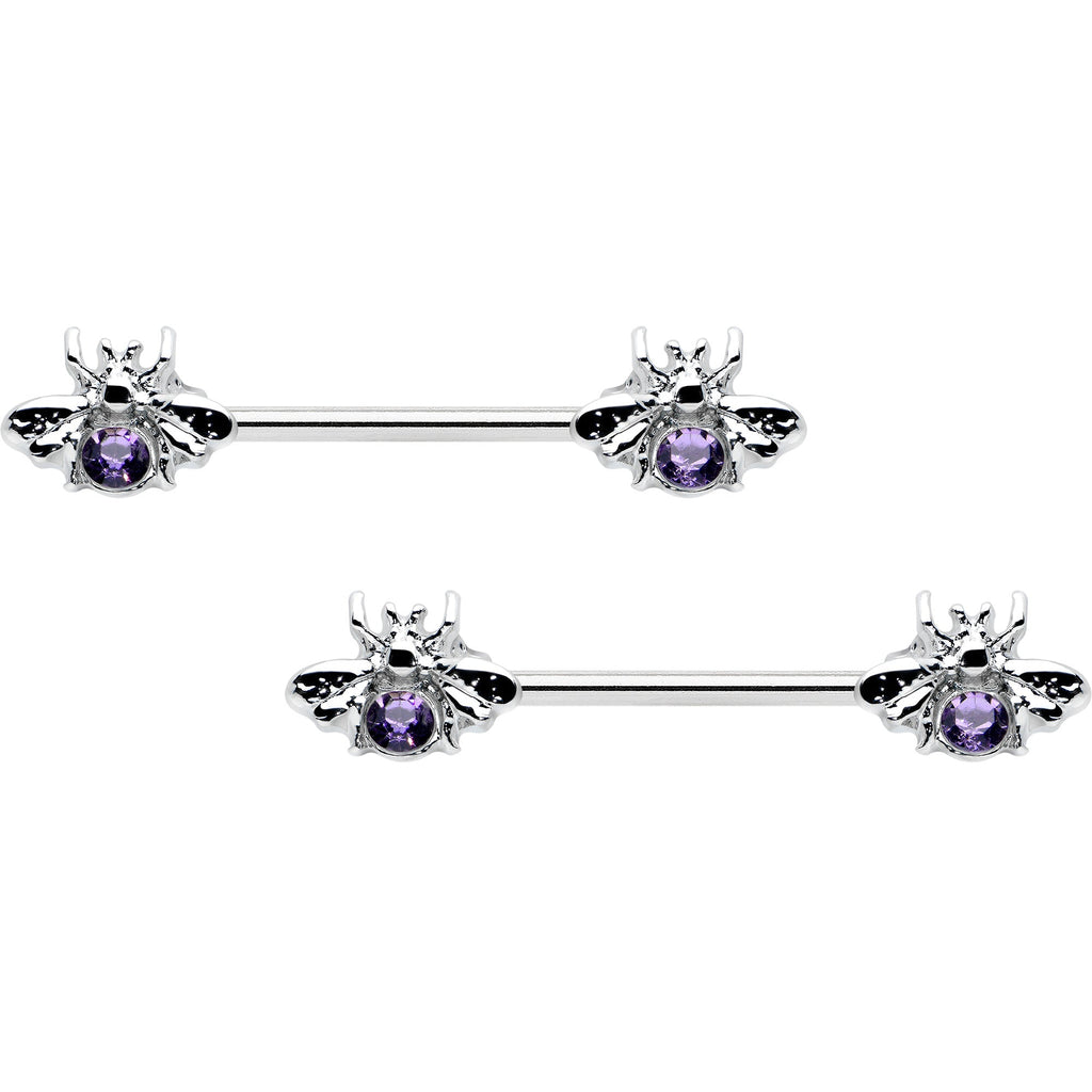 14G 9/16 Purple Gem Bee Beautiful Insect Barbell Nipple Ring Set